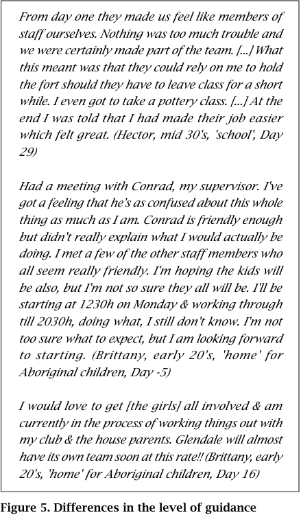 Chloe's solution leads into the final issue, which was that the level of guidance differed widely (Figure 5). This largely depended on the everyday composition of the workforce in the placement - in professional environments, students received guidance; where workers were largely well-meaning volunteers, there was often no guidance at all, and even inappropriate treatment. The students' capacity to improvise, and need to focus on the future, was far stronger when there was little guidance.
