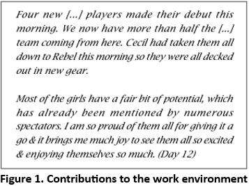 Far more appropriate was the ongoing development of organizational services, particularly where children and teenagers were the clients, when the policing students had sporting prowess, at State, national, and even international levels. Brittany was a case in point. She began her placement with the hope that she would be able to 'win the wary kids over', and that she 'would really love to be able to honestly feel that these kids have benefited in some way, or gained something from me also' (Day 1). She achieved both (Figure 1).