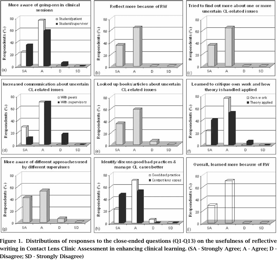 All the students strongly agreed or agreed that they communicated more with their peers but only three students (S3, S5, S7) (18%) disagreed that they were also communicating more frequently with their supervisors to discuss contact lens related issues (Figure 1d). Of the 17 students, only one student (S17) (6%) disagreed that s/he looked up books/ articles about uncertain CL-related issues as a result of having to do this RW exercise (Figure 1e)