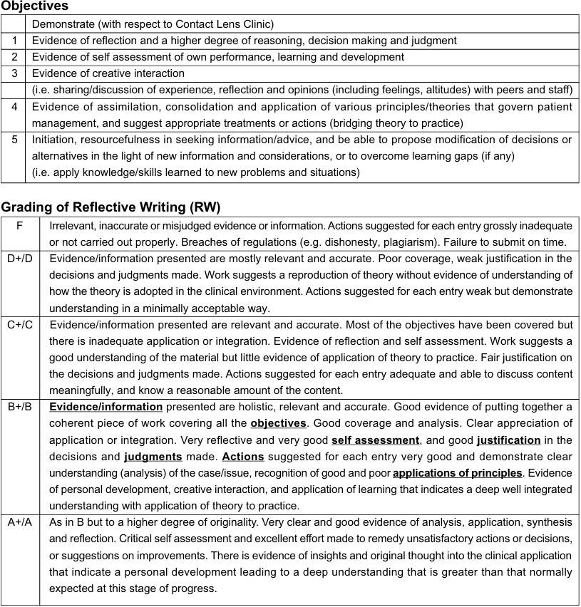 The main aim of this exercise is for students to critically reflect and meaningfully reconstruct and analyze their clinical experiences, to encourage greater self-awareness and cultivate an integrated professional and personal identity related to the roles of an optometrist.