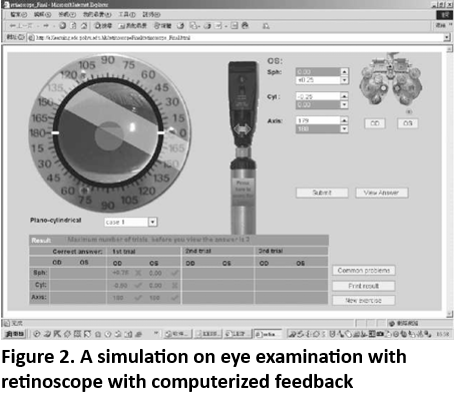 Another example of enriched interaction-with-content type of assessment is in developing simulations that react to students' actions in a similar way to a real-life situation. The teachers of an optometry course felt that their student optometrists had limited practice with real clients in eye examinations using an apparatus known as a retinoscope. They therefore created a virtual retinoscope for their students to practice examining patients' eyes online. The retinoscope simulation is programed so that its operation very closely resembles how the real equipment operates. For example, adjusting the 'knob' horizontally would simulate a yellow light beaming into a client's eye. Just like would happen in a "real" eye examination, the student optometrist then needs to adjust the angle of the beam until it is parallel to the reflected beam appearing in the pupil as a red band observed in the middle of the lens. In the simulated retinoscope the student optometrist must then adjust a lens of different focal lengths by clicking the figures on the screen until the reflected red band makes the correct response (stops moving in the opposite direction to the yellow light). After completing the test on the right eye, a similar procedure is then carried out with the left eye. When examination of both eyes has been completed, the student can then check their findings against the correct answer. In this way, the virtual machine is able to provide very accurate feedback that reflects the level of skill required to handle the actual apparatus (Figure 2). An enriched bilateral interaction between students and the online content is thus achieved when students can repeatedly practice and be assessed on accuracy.