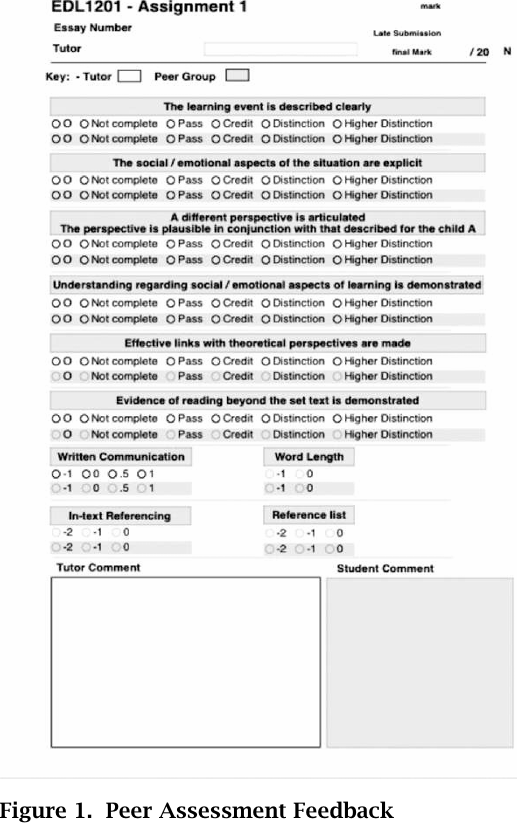 The students received a professionally presented assessment form which indicated the marks and comments of their tutor and their peers' assessment (shaded) (see Figure 1). Although the tutor mark was considered the official mark, students benefited from receiving their peers' perspective, which added another dimension to their feedback.