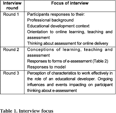 The first interview series focused on participants' backgrounds, approaches and professional orientations towards assessment that was beginning to incorporate online elements; the second interview series targeted responses to a range of e-assessments categories derived from the literature, as well as seeking responses to a framework developed from the first round; the final round of interviews will take up issues explored as well as returning to ongoing influences and critical events that are impacting on participants' thinking about assessment in online environments.