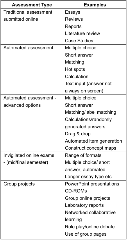 Table 2 relates broad categories of assessment to examples of assessment that may be conducted online. The advantages of web-based assessment have been widely recognized. Zhang, Khan, Gibbons and Ni (2002) typically highlight the fact that it can reach a large population; it is time, place and platform independent, with simple update procedures; and it offers enhanced opportunities to collect and analyze feedback. They also add that web-based assessment tools support different media such as plain text, rich text format, still image, video and audio in representing assessment items. O'Reilly (2001) also notes the easy links to real data, the availability of expert help, possibility of rapid feedback, archival options of all interactions, more time for preparation of assignments with online submissions and the human-human interaction, as well as human-computer interaction in relation to online assessment. What is being recognized by these authors are the learning affordances that the technology offers.