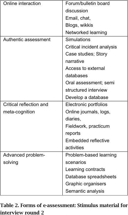 As part of the methodology a spectrum of types of e assessment, presented in Table 2, was derived from the literature and participants were invited to comment on various issues arising from the table as well as to suggest refinements. The rationale was to explore participants' thinking about assessment across a spectrum of types of e-assessment. Some reporting and analysis of participant comments on the categories in Table 2 are presented in the following section on Results, analysis and discussions. The fact that Table 2 is entitled Forms of E-assessment is not an assumption that with online delivery a new category of assessment is created. What is being explored is the thinking about assessment when there is an intersection of pedagogy and technology in online environments.