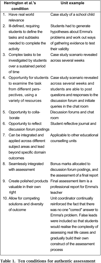 The design of the assessment and learning environment for this project attempted to address all ten of the characteristics described by Herrington et al. (2003, pp. 2-3) as essential for authentic learning activities. These are outlined in Table 1.