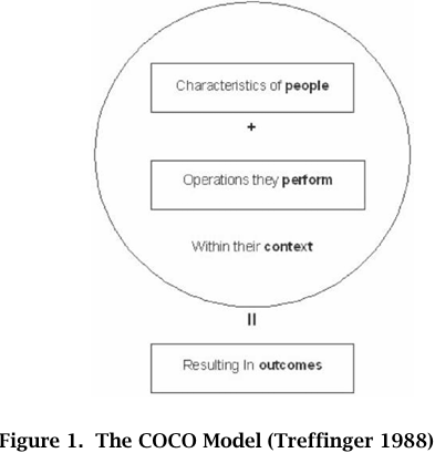 Among the different measurements of the creativity of a person, the process, the product and the environment, MacKinnon (1978) referred to the creative product as the "bedrock" of creativity research. MacKinnon argued that the product was the one area through which researchers could discover much about the other facets of creativity. Examination of the product reflects qualities of the person who created the product, the process used to form the product, and aspects of the environment in which the product was developed. As Amabile (1982) stated, "a product-centered operational definition is clearly most useful for empirical research in creativity" (p.1001). The relationship between the four components is shown clearly in Treffinger's COCO Model (Figure 1). Many other researchers have also conducted research focused on the creative product. Besemer & Treffinger (1981) focused on the qualities that distinguish creative products from those that are less creative while Rogers (1983) was interested in the adoption of new ideas, practices, or objects by society.