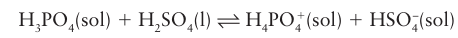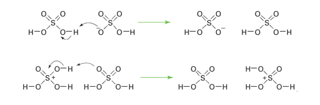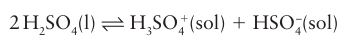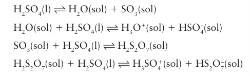 Key point: The autoionization of anhydrous sulfuric acid is complex, with several competing side reactions. Anhydrous sulfuric acid is an acidic solvent. It has a high relative permittivity and is vis cous because of extensive hydrogen bonding (Section 10.6). Despite this association the solvent is appreciably autoionized at room temperature. The major autoionization is