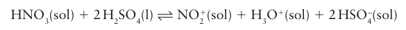 An important reaction is that of nitric acid with sulfuric acid to generate the nitronium ion, NO2, which is the active species in aromatic nitration reactions: