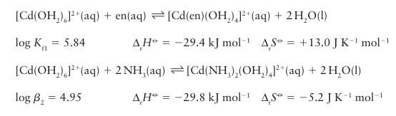 Two similar Cd N bonds are formed in each case, yet the formation of the chelate containing complex is distinctly more favourable. This greater stability of chelated complexes compared with their nonchelated analogues is called the chelate effect. The chelate effect can be traced primarily to differences in reaction entropy between chelated and nonchelated complexes in dilute solutions. The chelation reaction results in an increase in the number of independent molecules in solution. By contrast, the nonchelating reaction produces no net change (compare the two chemical equations above). The former therefore has the more positive reaction entropy and hence is the more favourable process. The reaction entropies measured in dilute solution support this interpretation. The entropy advantage of chelation extends beyond bidentate ligands, and ap plies, in principle, to any polydentate ligand. In fact, the greater the number of donor sites the multidentate ligand has, the greater is the entropic advantage of displacing monodentate ligands. Macrocyclic ligands, where multiple donor atoms are held in a cyclic array, such as crown ethers or phthalocyanin (77), give complexes of even greater stability than might otherwise be expected. This so-called macrocyclic effect is thought to be a combination of the entropic effect seen in the chelate effect, together with an additional energetic contribution that comes from the preorganized nature of the ligating groups (that is, no additional strains are introduced to the ligand on coordination). The chelate and macrocyclic effects are of great practical importance. The majority of reagents used in complexometric titrations in analytical chemistry are polydentate chelates like edta4 , and most biochemical metal binding sites are chelating or macrocylic ligands. A formation constant as high as 1012 to 1025 is generally a sign that the chelate or macro cyclic effect is in operation. In addition to the thermodynamic rationalization for the chelate effect we have described, there is an additional role in the chelate effect for kinetics. Once one ligating group of a polydentate ligand has bound to a metal ion, it becomes more likely that its other ligating groups will bind, as they are now constrained to be in close proximity to the metal ion; thus chelate complexes are favoured kinetically too.