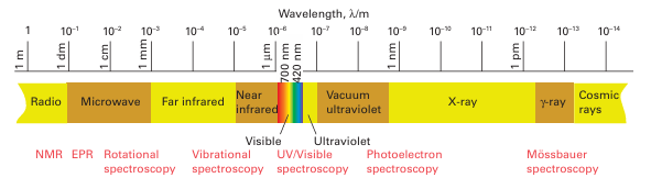 The majority of physical techniques used to investigate inorganic compounds involve the absorption and sometimes the re-emission of electromagnetic radiation. The frequency of the radiation absorbed provides useful information on the energy levels of an inorganic compound and the intensity of the absorption can often be used to provide quantitative analytical information. Absorption spectroscopy techniques are normally nondestructive as after the measurement the sample can be recovered for further analysis. The spectrum of electromagnetic radiation used in chemistry ranges from the short wavelengths associated with - and X-rays (about 1 nm), to radiowaves with wave lengths of several metres (Fig. 8.8). This spectrum covers the full range of atomic and molecular energies associated with characteristic phenomena such as ionization, vibration, rotation, and nuclear reorientation. Thus, X- and ultraviolet (UV) radiation can be used to determine the electronic structures of atoms and molecules and infrared (IR) radiation can be used to examine their vibrational behaviour. Radiofrequency (RF) radiation, in nuclear magnetic resonance (NMR), can be used to explore the energies associated with reorientations of the nucleus in a magnetic field, and those energies are sensitive to the chemical environment of the nucleus. In general, absorption