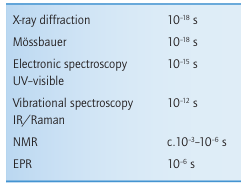 spectroscopic methods make use of the absorption of electromagnetic radiation by a molecule or material at a characteristic frequency corresponding to the energy of a transition between the relevant energy levels. The intensity is related to the probability of the transition, which in turn is determined in part by symmetry rules, such as those described in Chapter 6 for vibrational spectroscopy. The various spectroscopic techniques involving electromagnetic radiation have different associated timescales. This variation can influence the structural information that is extracted. When a photon interacts with an atom or molecule we need to consider fac tors such as the lifetime of any excited state and a how a molecule may change during that interval. Table 8.2 summarizes the timescales associated with various spectroscopic techniques discussed in this section. Thus IR spectroscopy takes a much faster snapshot of the molecular structure than NMR, for a molecule may have time to reorientate or change shape in a nanosecond. The temperature at which data are collected should also be taken into account as molecular reorientation rates increase with increasing temperature.