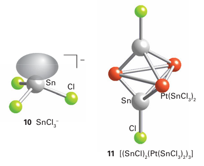 Tin dihalides and tetrahalides are both well known. The tetrachloride, tetrabromide, and tetraiodide are molecular com pounds, but the tetrafluoride is an ionic solid formed from close as an ionic solid but, as a manifestation of the inert-pair effect, PbCl4 is an unstable, covalent, yellow oil that decomposes into PbCl2 and Cl2 at room temperature. Lead tetrabromide and tetraiodide are unknown, so the dihalides dominate the halogen compounds of lead. The arrangement of halogen atoms around the central metal atom in the dihalides of tin and lead often deviates from simple tetrahedral or octahedral coordination and is attributed to the presence of a stereochemically active lone pair. The tendency to achieve the distorted structure is more pronounced with the smallion, and less distorted structures are observed with larger halides. Both Sn (IV) and Sn (II) form a variety of complexes. Thus, SnCl4 forms complex ions such as SnCl5 and SnCl6 -2 in acidic solution. In nonaqueous solution, a variety of donors interact with the moderately strong Lewis acid SnCl4 to form complexes such as cis-SnCl4 (OPMe3 )2. In aqueous and nonaqueous solutions Sn (II) forms trihalo complexes, such as SnCl3, where the pyramidal structure indicates the presence of a stereochemically active lone pair (10). The SnCl3 ion can act as a soft donor to d-metal ions. One unusual example of this ability is the red cluster compound Pt3 Sn8Cl20, which is trigonal bipyramidal (11).