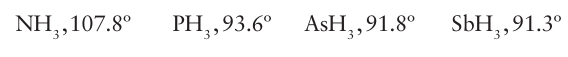 The large change in bond angle has been attributed to a decrease in the extent of sp3 hybridization from NH3 to SbH3 but is more likely to be due to steric effects. The E-H bonding pairs of electrons will repel each other. This repulsion is greatest when the central element, E, is small, as in NH3, and the H atoms will be as far away from each other as possible in a near-tetrahedral arrangement. As the size of the central atom is increased down the series, the repulsion between bonding pairs decreases and the bond angle is close to 90º. It is evident from the boiling points plotted in Fig. 10.6 that PH3, AsH3, and SbH3 are subject to little, if any, hydrogen bond ing with themselves; however, PH3 and AsH3 can be protonated by strong acids, such as HI, to form phosphonium and arsoniumions, PH4+ and AsH4+, respectively.