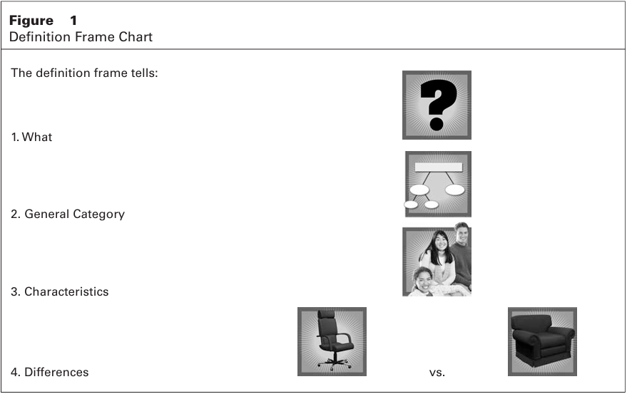 Now let’s look at an example of how a definition frame can be used with ELLs at different stages of language acquisition. Students in Mr. Tate’s 3rd grade life science class are studying grasshoppers. Today, he is showing them a film. To guide their viewing, Mr. Tate presents the students with the four guiding definition frame questions listed above. For ELLs, he includes the chart depicted in Figure 1, with the frame questions accompanied by visuals.