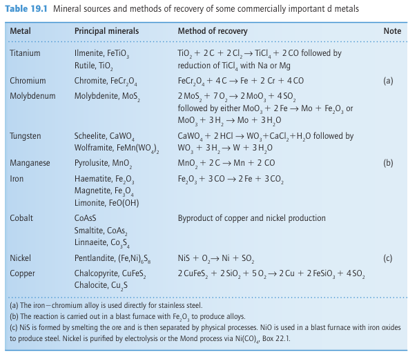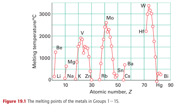 Metallic bonding was covered in Chapter 3, which introduced the concept of band structure. Generally speaking, the same band structure is present for all the d-block metals and arises from the overlap of the (n+1)s orbitals to give an s band and of the nd orbitals to give a d band. The principal differences between the metals is the number of electrons available to occupy these bands: Ti (3d24s2) has four bonding electrons, V (3d34s2) five, Cr (3d54s1) six, and so on. The lower, net bonding region of the valence band is therefore progressively filled with electrons on going to the right across the block, which results in stronger bonding, until around Group 7 (at Mn, Tc, Re) when the electrons begin to populate the upper, net antibonding part of the band. This trend in bonding strength is reflected in the increase in melting point from the low-melting alkali metals (effectively only one bonding electron for each atom, resulting in melting points typically less than 100ºC) up to Cr, and its decline thereafter to the low-melting Group 12 metals (mercury being a liquid at room temperature, Fig. 19.1 and Section 9.2). The strength of metallic bonding in tungsten is such that its melting point (3410ºC) is exceeded by only one other element, carbon. The radii of d-metal ions depend on the effective charge of the nucleus, and ionic radii generally decrease on moving to the right as the atomic number increases. The radius of the metal atoms in the solid element is determined by a combination of the strength of the metallic bonding and the size of the ions. Thus, the separations of the centres of the atoms in the solid generally follow a similar pattern to the melting points: they decrease to the middle of the d block, followed by an increase back up to Group 12, with the smallest separations occurring in and near Groups 7 and 8. The atomic radii of the elements in the 5d series (Hf, Ta, W,...) are not much bigger than those of their 4d-series congeners (Zr, Nb, Mo,...). In fact, the atomic radius of Hf