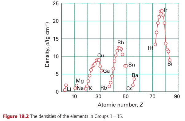 is smaller than that of Zr even though it appears in a later period. To understand this anomaly, we need to consider the effect of the lanthanoids (the first row of the f block). The intervention of the lanthanoid elements in Period 6 corresponds to the occupation of the poorly shielding 4f orbitals. Because the atomic number has increased by 32 between Zr in Period 5 and its congener Hf in Period 6 without a corresponding increase in shielding, the overall effect is that the atomic radii of the 5d-series elements are much smaller than expected. This reduction in radius is the lanthanide contraction introduced in Section 1.9a. The lanthanide contraction also affects the ionization energies of the 5d-series elements, making them higher than expected on the basis of a straightforward extrapolation. Some of the metals—specifically Au, Pt, Ir, and Os—have such high ionization energies that they are unreactive under normal conditions. Atomic mass increases with atomic number, and the combination of this increase with the changes in the radii of the metal atoms in the metal lattice means that the mass densities of the elements reach a peak with Ir (density 22.65 g cm3). Figure 19.2 illustrates this trend.