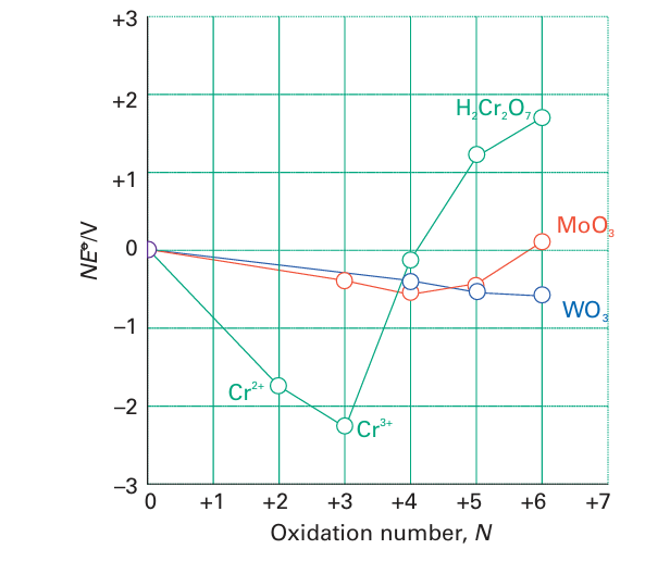 Figure 19.5 A Frost diagram for the chromium group in the d block (Group 6) in acidic solution (pH=0).