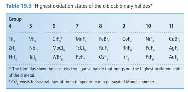 across the d block: for Groups 4-10 the highest oxidation state of an element becomes more stable on descending a group, with the greatest change in stability occurring between the first two series of the block. The increasing stability of high oxidation states for the heavier d metals can be seen in the formulas of their halides (Table 19.3), and the limiting formulas MnF4, TcF6, and ReF7 show a greater ease of oxidizing the 4d- and 5d-series metals than the 3d-series. The hexa- fluorides of the heavier d metals (as in PtF6) have been prepared from Group 6 through to Group 10 except for Pd. In keeping with the stability of high oxidation states for the heavier metals, WF6 is not a significant oxidizing agent. However, the oxidizing character of the hexafluorides increases to the right, and PtF6 is so potent that it can oxidize O2 to O+2: