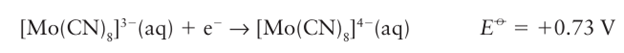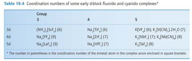 As might be anticipated from consideration of atomic and ionic radii, the 4d- and 5d series elements often have higher coordination numbers than their smaller 3d-series co geners. Table 19.4 illustrates this trend for the fluorido and cyanido complexes of the early d metals. Note that with the small F ligand, these 3d-series metals tend to form six coordinate complexes but that the larger 4d- and 5d-series metals in the same oxidation state tend to form seven-, eight-, and nine-coordinate complexes. The octacyanidomoly- bdate complex, [Mo(CN)8]3- , illustrates the tendency towards high coordination numbers with compact ligands. The same complex is readily reduced electrochemically or chemically without change of coordination number: