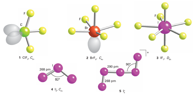 The shapes of interhalogen molecules (1), (2), and (3) are largely in accord with the VSEPR model (Section 2.3). For example, the XY3 compounds (such as ClF3) have five valence electron pairs around the X atom in a trigonal–bipyramidal arrangement. The Y atoms attach to the two axial pairs and one of the three equatorial pairs, and then the two axial bonding pairs move away from the two equatorial lone pairs. As a result, XY3 molecules have a C2v bent T shape. There are some discrepancies: for example, ICl3 is a Cl-bridged dimer. The Lewis structure of XF5 has five bonding pairs and one lone pair on the central X atom and, as expected from the VSEPR model, XF5 molecules are square pyramidal. As already mentioned, the only known XY7 compound is IF7, which is predicted to be pentagonal bipyramidal. The experimental evidence for its actual structure is inconclusive. As with other hypervalent molecules, the bonding in IF7 can be explained without invoking d-orbital participation by adopting a molecular orbital model in which bonding and non-bonding orbitals are occupied but antibonding orbitals are not. Polymeric interhalogens may also be formed and may be cationic or anionic. Examples of cationic polyhalides are I+3 (4) and I5+ (5). Anionic polyhalides are most numerous for io dine. The I-3 ion is the most stable but others with the general formula [(I2)n I-] are formed. Other anionic polyhalides include Cl-3 and BrF-4.