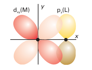 Figure 20.19 The π overlap that may occur between a ligand p orbital perpendicular to the M-L axis and a metal dxy orbital. (Section 22.5). Phosphines (PR3) are also able to accept π-electron density and also act as π acceptors (Section 22.6). Because the π-acceptor orbitals on most ligands are higher in energy than the metal d orbitals, they form molecular orbitals in which the bonding t2g combinations are largely of metal d-orbital character (Fig. 20.21). These bonding combinations lie lower in energy than the d orbitals themselves. The net result is that π-acceptors increase ∆O. We can now put the role of π bonding in perspective. The order of ligands in the spectrochemical series is partly that of the strengths with which they can participate in M-L Ϭ bonding. For example, both CH3- and H- are very high in the spectrochemical series because they are very strong Ϭ donors. However, when π bonding is significant, it has a strong influence on ∆O: π-donor ligands decrease ∆O and π-acceptor ligands increase ∆O. This effect is responsible for CO (a strong π acceptor) being high on the spectrochemical series and for OH- (a strong π donor) being low in the series. The overall order of the spectrochemical series may be interpreted in broad terms as dominated by π effects (with a few important exceptions), and in general the series can be interpreted as follows: