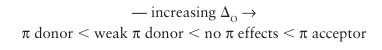 Figure 20.20 The effect of π bonding on the ligand-field splitting parameter. Ligands that act as π donors decrease ∆O. Only the π orbitals of the ligand are shown.