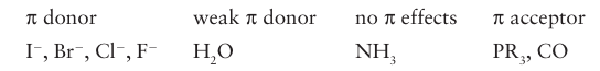 Notable examples of where the effect of bonding dominates include amines (NR3), CH3-, and H, none of which has orbitals of π symmetry of an appropriate energy and thus are neither π-donor nor π-acceptor ligands. It is important to note that the classification of a ligand as strong-field or weak-field does not give any guide as to the strength of the M—L bond.