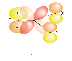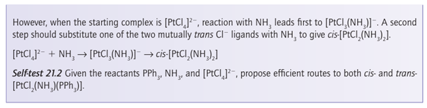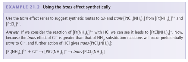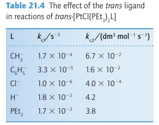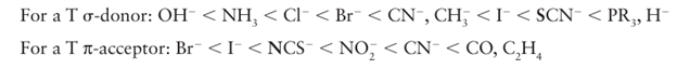 Key point: A strong -donor ligand or π-acceptor ligand greatly accelerates substitution of a ligand that lies in the trans position. The spectator ligands T that are trans to the leaving group in square-planar complexes influence the rate of substitution. This phenomenon is called the transeffect. It is generally accepted that the trans effect arises from two separate influences: one arising in the ground state and the other in the transition state itself. Thetransinfluence is the extent to which the ligand T weakens the bond trans to itself in the ground state of the complex. The trans influence correlates with the -donor ability of the ligand T because, broadly speaking, ligands trans to each other use the same orbitals on the metal for bonding. Thus if one ligand is a strong donor, then the ligand trans to it cannot donate electrons to the metal so well, and thus has a weaker interaction with the metal. The trans influence is assessed quantitatively by measuring bond lengths, stretching frequencies, and metal-to-ligand NMR coupling constants (Section 8.5). The transition state effect correlates with the π-acceptor ability of the ligand. Its origin is thought to be the increase in electron density on the metal atom arising due to the incoming ligand: any ligand that can accept this increased electron density will stabilize the transition state (1). The trans effect is the combination of both effects; it should be noted that the same factors contribute to a large ligand-field splitting. Trans effects are listed in Table 21.4 and follow the order: