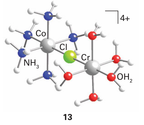 Key point: The rate-determining step of an inner-sphere redox reaction may be any one of the component processes, but a common one is electron transfer. The inner-sphere mechanism was first confirmed for the reduction of the nonlabile com plex [CoCl (NH3)5]+2 by Cr2 (aq). The products of the reaction included both Co2 (aq) and [CrCl (OH2)5]+2, and addition of 36Cl to the solution did not lead to the incorporation of any of the isotope into the Cr (III) product. Furthermore, the reaction is much faster than reactions that remove Cl from nonlabile Co (III) or introduce Cl into the nonlabile [Cr (OH2)6]+3 complex. These observations suggest that Cl has moved directly from the coordination sphere of one complex to that of the other during the reaction. The Cl attached to Co(III) can easily enter into the labile coordination sphere of [Cr (OH2)6]+2 to produce a bridged intermediate (13). Inner-sphere reactions, though involving more steps than outer-sphere reactions, can be fast. Figure 21.16 summarizes the steps necessary for such a reaction to occur.