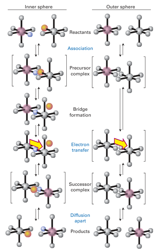 Figure 21.16 The different pathways followed by inner- and outer-sphere mechanisms.
