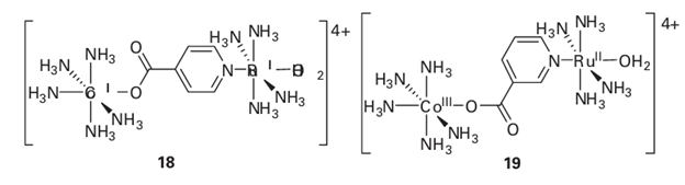 A brief illustration. Therate constant for the oxidation of the Ru (II) centre by the Co (III) centre in the bimetallic complex (18) is 1.0 102 dm3 mol 1 s 1, whereas the rate constant for complex (19) is 1.6 10 2 dm3 mol 1 s 1. In both complexes there is a pyridine carboxylic acid group bridging the two metal centres. These groups are bound to both metal atoms and could facilitate an 4Somebridged intermediates have been isolated with the electron clearly located on the bridge, but we shall not consider these here.