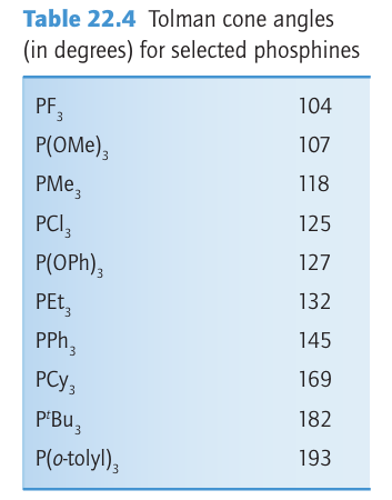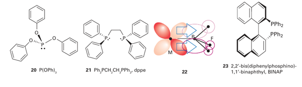 Key point: Phosphines bond to metals by a combination of σ donation from the P atom and π back bonding from the metal atom. Although phosphine complexes are not organometallic because the ligands do not bond to the metal atom through a carbon atom, they are best discussed here as their bonding has many similarities to that of carbon monoxide. Phosphine, PH3 (formally, phosphane), is a reactive, noxious, poisonous, and flammable gas (Section 15.10). Like ammonia, phosphine can behave as a Lewis base and use its lone pair to donate electron density to a Lewis acid, and so act as a ligand. However, given the problems associated with handling phosphine, it is rarely used as a ligand. Substituted phosphines, on the other hand, such as trialkylphosphines (for example, PMe3 , PEt3 ), or triarylphosphines (for example, PPh3 , 10), or trialkyl- or triarylphosphites (for example, P(OMe)3 , P(OPh)3 , 20) and a whole host of bridged multidentate di- and triphosphines (for example, Ph2PCH2CH2 PPh2=dppe, 21) are easy to handle (indeed some are air-stable odourless solids with no appreciable toxicity) and are widely used as ligands; all are colloquially referred to as ‘phosphines’. Phosphines have a lone pair on the P atom that is appreciably basic and nucleophilic, and can serve as a σ donor. Phosphines also have empty orbitals on the P atom that can overlap with filled d orbitals on 3d-metal ions and behave as π acceptors (22). The bond ing of phosphines to a d-metal atom, made up of a σ bond from the ligand to the metal and a π bond from the metal back to the ligand, is completely analogous to the bonding of CO to a d-metal atom. Quite which orbitals on the P atom behave as π acceptors has been the subject of considerable debate in the past with some groups claiming a role for unoccupied 3d orbitals on P, and some claiming a role for the P R σ* orbitals; current consensus favours the σ* orbitals. In any case, each phosphine provides an additional two electrons to the valence electron count. As we have remarked, a huge variety of phosphines are both possible and widely available, including chiral systems such as 2,2-bis(diphenylphosphino)-1,1-binaphthyl (BINAP, 23), in which steric constraints result in compounds that can be resolved into diastereomers. Generally there are two properties of phosphine ligands that are considered important in discussions of the reactivity of their complexes: their steric bulk and their electron donating (and accepting) ability. We described in Section 21.6 how the steric bulk of phosphines can be expressed in terms of the notional cone occupied by the bonded ligand, and Table 22.4 lists some of the derived cone angles. The bonding of phosphines to d-metal atoms is, as we have seen, a composite of σ bonding from the ligand to the metal atom, and π backbonding from the metal atom to the ligand. The σ-donating ability and π-acceptor ability of phosphines are inversely