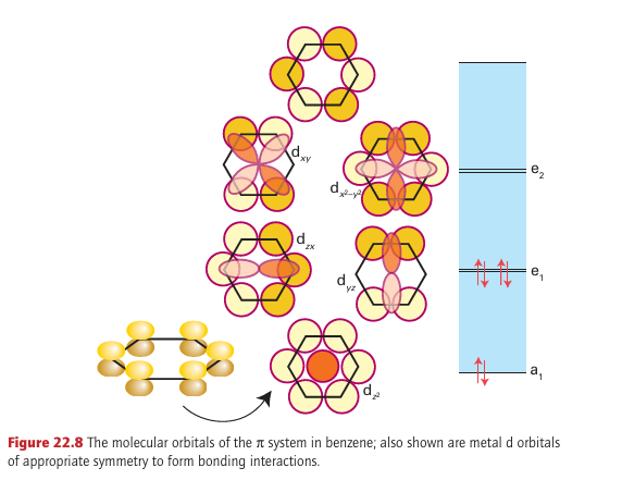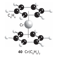 Key point: A consideration of the MOs of benzene leads to a picture of bonding of benzene to a metal atom that includes a significant δ back bonding interaction. If benzene is considered to have three localized double bonds, each double bond can behave as a ligand and the molecule could behave as a tridentate η6-ligand. A compound such as bis(η6-benzene) chromium (40) could then be considered to be made up of six coordinated double bonds, each donating two electrons, bound to a d6 metal atom, giving a total of 18 valence electrons for the octahedral complex. Bis(η6-benzene) chromium does exist, and is remarkably stable: it can be handled in air and sublimes with no decomposition. Although this description of the bonding is a first step towards understanding its structure, the true picture needs a deeper consideration of the molecular orbitals involved. In the molecular orbital picture of the π bonding in benzene there are three bonding and three antibonding orbitals. If we consider a single benzene molecule bonding to a single metal, and consider only the d orbitals, the strongest interaction is a σ interaction between the most strongly bonding a1 benzene MO and the dz2 orbital of the metal atom; π bonds are possible between the two other bonding benzene MOs and the dzx and dyz orbitals. Back bonding from the metal atom to the benzene is possible as a δ interaction between the dx2-y2 and dxy orbitals and the empty antibonding e2 orbitals of benzene (Fig. 22.8). η6-Arenes are considered to be neutral ligands that donate six electrons and are normally considered to take up three coordination sites at a metal.