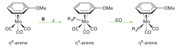 One commonly invoked reaction intermediate of η6-arene complexes is a ‘slipping’ to an η4 complex, which donates only four electrons to the metal, and therefore allows a substitution reaction to proceed without an initial ligand loss:
