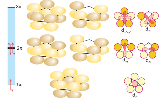 Key points: The common η5-bonding mode of a cyclopentadienyl ligand can be understood on the basis of both σ and π donation from the organic fragment to the metal in conjunction with δ back bonding; cycloheptatriene commonly forms either η6-complexes or η7-complexes of the aromatic tropilium cation (C7H7) +.