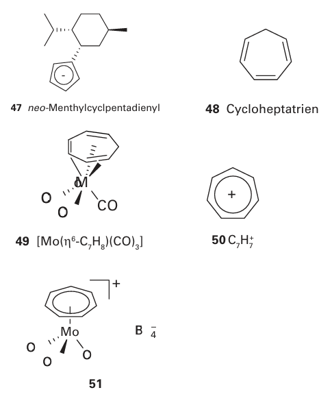 The electronic and steric properties of cyclopentadiene can easily be tuned: electron withdrawing and donating groups can be attached to the five-membered ring, and steric bulk can be enhanced by additional substitution. The pentamethylcyclopentadienyl ligand (Cp*) is commonly used to provide greater electron density on, and greater steric protection of, a metal atom. Chiral groups are often added to Cp groups so that complexes can be used in stereoselective reactions: the neo-menthyl group (47) is commonly used. The synthesis, properties, and reactivities of compounds containing the cyclopenta- dienyl ligand are discussed in more detail in Section 22.19. Cycloheptatriene, C7H8+ (48), can form η6-complexes such as (49), which may be treated as having three η2-alkene molecules bound to the metal atom. Hydride abstraction from these complexes results in formation of η7-complexes of the six-electron aromatic cation C7H7+ (50), for example (51). In η7-cycloheptatrienyl complexes, all carbon-carbon bond lengths are equal; bonding to the metal atom and back bonding from the metal are similar to those found in arene and cyclopentadienyl complexes.