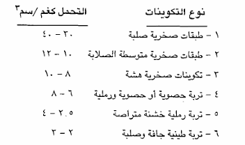 في حين تكون التربة أقل صلابة قابلة للانضغاط مثل التربة الرسوبية أو المتبقية والتي لا يمكن البناء فوقها بشكل مباشر إلا بعد إجراء تحسينات على خواصها، وعليه فالتكوينات السطحية تتباين في درجة تحملها حسب طبيعة تكوينها وكما يأتي: