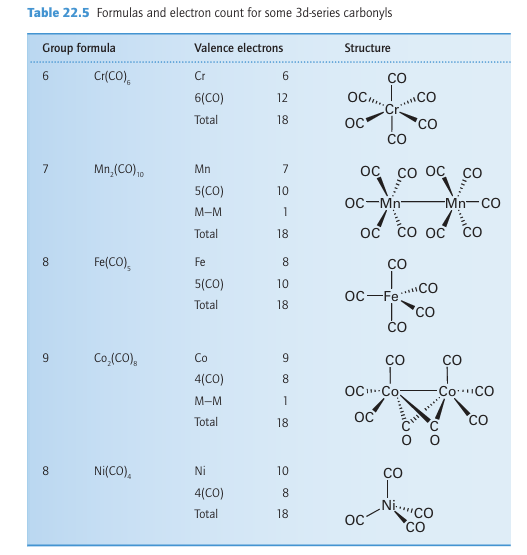 Key points: The carbonyls of the Period 4 elements of Groups 6 to 10 obey the 18-electron rule; they have alternately one and two metal atoms and a decreasing number of CO ligands. Ahomoleptic complex is a complex with only one kind of ligand. Simple homoleptic metal carbonyls can be prepared for most of the d metals, but those of Pd and Pt are so unstable that they exist only at low temperatures. No simple neutral metal carbonyls are known for Cu, Ag, and Au or for the members of Group 12. The metal carbonyls are useful synthetic precursors for other organometallic compounds and are used in organic syntheses and as industrial catalysts. The 18-electron rule helps to systematize the formulas of metal carbonyls. As shown in Table 22.5, the carbonyls of the Period 4 elements of Groups 6 to 10 have alternately one and two metal atoms and a decreasing number of CO ligands. The binuclear carbo nyls are formed by elements of the odd-numbered groups, which have an odd number of valence electrons and therefore dimerize by forming metal-metal (MM) bonds (each MM bond effectively increases the electron count on the metal by 1). The decrease in the number of CO ligands from left to right across a period matches the need for fewer CO ligands to achieve 18 valence electrons. The simple vanadium carbonyl V(CO)6 is an exception as it only has 17 valence electrons and is too sterically crowded to dimerize; it is, however, readily reduced to the 18-electron V(CO)6 anion.
