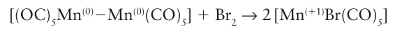 In keeping with the loss of electron density from the metal when a halogen atom is attached, the CO stretching frequencies of the product are significantly higher than those of [Mn2(CO)10].