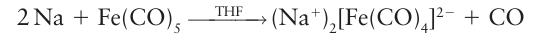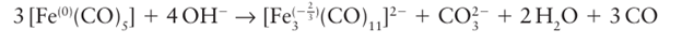 The metal carbonylate contains Fe with oxidation number 2, and it is rapidly oxidized by air. That much of the negative charge is delocalized over the CO ligands is confirmed by the observation of a low CO stretching band in the IR spectrum at about 1730 cm1. Polynuclear carbonyls, which obey the 18-electron rule through the formation of MM bonds, are generally cleaved by strong reducing agents. The 18-electron rule is obeyed in the product and a mononegative mononuclear carbonylate results: