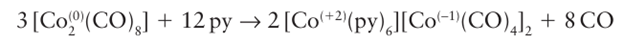 Some metal carbonyls disproportionate in the presence of a strongly basic ligand, producing the ligated cation and a carbonylate. Much of the driving force for this reaction is the stability of the metal cation when it is surrounded by strongly basic ligands. Octacarbonyldicobalt (0) is highly susceptible to this type of reaction when exposed to a good Lewis base such as pyridine (py):