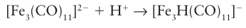 The affinity of metal carbonylates for the proton varies widely (Table 22.6). It is ob- served that, the greater the electron density on the metal centre of the anion, the higher its Brønsted basicity and hence the lower the acidity of its conjugate acid (the metal carbonyl hydride). As we noted in Section 22.7, d-block MH complexes are commonly referred to as ‘hydrides’, which reflects the assignment of oxidation number 1 to an H atom attached to a metal atom. Nevertheless, most of the carbonyl hydrides of metals to the right of the d block are Brønsted acids. The Brønsted acidity of a metal carbonyl hydride is a reflection of the π-acceptor strength of a CO ligand, which stabilizes the conjugate base. Thus, [CoH (CO)4] is acidic whereas [CoH (PMe3)4] is strongly hydridic. In striking contrast to p-block hydrogen compounds, the Brønsted acidity of d-block MH compounds decreases on descending a group. Neutral metal carbonyls (such as pentacarbonyl iron, [Fe (CO)5]) can be protonated in air-free concentrated acid; the Brønsted basicity of a metal atom with oxidation number zero is associated with the presence of nonbonding d electrons. Compounds having metal-metal bonds, such as clusters (Section 22.20), are even more easily protonated; here the Brønsted basicity is associated with the ready protonation of MM bonds to produce a formal 3c,2e bond like that in diborane: