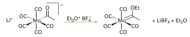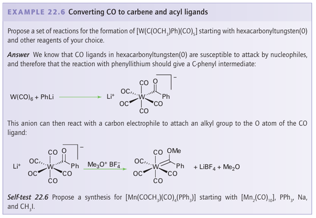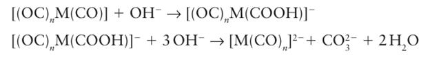 The product of this reaction, with a direct MC bond, is a Fischer carbene (Section 22.15). The attack of a nucleophile on the C atom is also important for the mechanism of the hydroxide-induced dissociation of metal carbonyls: