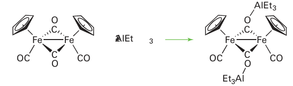 In electron-rich metal carbonyls, considerable electron density is delocalized on the CO ligand. As a result, in some cases the O atom of a CO ligand is susceptible to attack by electrophiles. Once again, IR data provide an indication of when this type of reaction should be expected, as a low CO stretching frequency indicates significant backdonation to the CO ligand and hence appreciable electron density on the O atom. Thus, a bridging carbonyl is particularly susceptible to attack at the O atom: