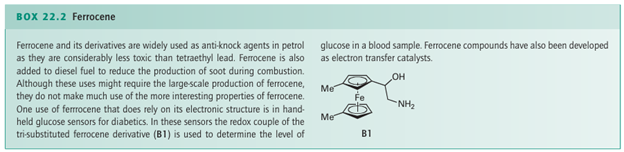 The distinction between cage and cluster compounds can seem arbitrary as the presence of bridging ligands in a cluster such as (76) raises the possibility that the atoms are held together by M L M interactions rather than MM bonds. Bond lengths are of some help in resolving this issue. If the MM distance is much greater than twice the metallic radius, then it is reasonable to conclude that the MM bond is either very weak or absent. However, if the metal atoms are within a reasonable bonding distance, the proportion of the bonding that is attribut able to direct MM interaction is ambiguous. For example, there has been much debate about the extent of Fe-Fe bonding in [Fe2 (CO)9] (77). Metal-metal bond strengths in metal complexes cannot be determined with great precision, but a variety of pieces of evidence—such as the stability of compounds and MM force constants—indicate that there is an increase in M-M bond strengths down a group in the d block. This trend contrasts with that in the p block, where element-element bonds are usually weaker for the heavier members of a group. As a consequence of this trend, metal-metal bonded systems are most numerous for the 4d- and 5d-series metals.