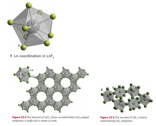 The lanthanoid (III) trihalides have complex structural characteristics as a result of the high coordination numbers for these large ions. For example, in LaF3 the La3+ ion is in an irregular 11-coordinate environment and in LaCl3 it is in a nine-coordinate, capped anti-square prismatic environment (Fig. 23.4). Towards the end of the series the trihalides of the smaller lanthanoids have different structure types with lower coordination numbers for the same halide, as expected in view of the decrease in ionic radius. In LnF3, Ln has a nine-coordinate environment which can be considered as a capped anti-square prismatic environment distorted or a tricapped trigonal prism (1) and the compounds LnCl3 have layer structures based on six-coordinate Ln in a cubic close-packed array of Cl ions. Cerium is the only lanthanoid to form a tetrahalide (CeF4); it crystallizes with a structure formed from vertex-sharing CeF8 polyhedra (Fig. 23.5).
