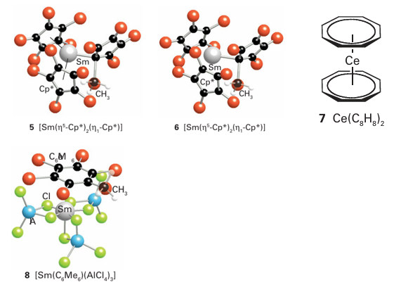 The great majority of lanthanoid organometallic compounds formally contain Ln (III) with a limited number of Ln (II) compounds: no other oxidation states are known. -Bonded alkyl groups are common, with compounds containing the cyclopentadienyl ligands tending to dominate. It is best to consider cyclopentadienyl compounds as containing Cp groups electrostatically bound to a central Ln3+ (or Ln2+) cation; this view is supported by the observation that the La compounds are diamagnetic. Com pounds containing 8-cyclooctatetraene ligands are known, such as Ce (C8H8)2 (7), and, as noted in Section 22.11, it is best to consider these to be complexes of the electron-rich C8H8-2 ion as ligand. Current research into lanthanoid organometallic compounds typically involves com pounds of the type [(Cp)2LnR]2, [(Cp)2LnR(sol)], [(Cp*) LnRX(sol)], and [(Cp*) LnR2 (sol)]. A number of arene complexes are also known, such as [(C6Me6) Sm (AlCl4)3] (8), where it is thought that the bonding is largely the result of an electrostatically induced dipole between the Sm3 ion and the electron-rich ring.