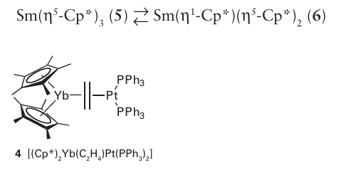 Key points: The organometallic compounds of the lanthanoids are dominated by good donor ligands, with complexes of acceptor ligands being rare; the bonding in complexes is best treated on the basis of ionic interactions; there are similarities between the organometallic compounds of the lanthanoids and those of the early d metals. In line with the picture of the lanthanoid ions as having no directional frontier orbitals, it should not be surprising that they do not exhibit a rich organometallic chemistry. In particular, the lack of any orbitals that can back bond to organic fragments (because the 5d orbitals are empty and the 4f orbitals are buried) restricts the number of bonding modes that are available. In addition, the strongly electropositive nature of the lanthanoids means that they need good donor, not good acceptor, ligands. Thus alkoxide, amide, and halide ligands, which are both and π donors, are common, whereas CO and phosphine ligands, which are both donors and π acceptors, and which do such a good job in stabilizing low oxidation state d-metal complexes, are rarely seen in lanthanoid chemistry. Indeed, under normal laboratory conditions, neutral metal carbonyl compounds are unknown for the f-block elements. As an example of the contrasting behaviour of organometallic complexes of the d and f blocks it should be noted that the first 2-alkene complex of a lanthanoid was characterized only in 1987, a century and a half after the first d-metal alkene complex, Zeise’s salt, was isolated. This lanthanoid alkene complex, [(Cp*)2 Yb(C2H4) Pt (PPh3)2] (4), has a particularly electron-rich alkene as it is already bound to an electron-rich Pt (0) centre, and it is thought that the alkene therefore needs no backbonding from the Yb atom to stabilize it. The bonding in the organometallic lanthanoid complexes that does form is predominantly ionic and is governed by electrostatic factors and steric requirements. Consequently there is no need for the 18-electron rule to be obeyed. Although there is a chemical uniformity across the f block, there is also a gradation of change with steric factors tending to dominate: a small change in ligand size can make a significant difference to reactivity. Owing to the weakness of the bonds, the lanthanoid complexes remain strong Lewis acids and the complexes are therefore very sensitive to air and moisture. The first organometallic compounds of the lanthanoids were cyclopentadienyl com pounds: G. Wilkinson made a large number of Ln(Cp)3 compounds with a wide variety of electron counts in 1954. The large lanthanoid ions can easily accommodate three cyclopentadienyl ligands, and they even tend to oligomerize, indicating that there is yet more space for additional ligands. Compounds of substituted cyclopentadienyl ligands are possible but the limit seems to have been reached with the sterically demanding pentameth-ylcyclopentadienyl (Cp*) ligand. It was, however, nearly 40 years after the original Ln (Cp)3 compounds were isolated that Ln (Cp*)3 compounds were obtained, and even then, they exist in equilibrium: