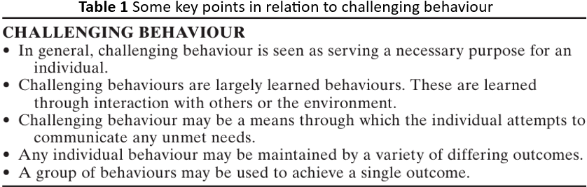 Reeves (1997) has commented that learning disabled people may have identifiable neurological dysfunctions which are often misinterpreted as challenging behavior and are therefore left untreated. The exploration of the physical causations of challenging behavior indicates that some phenotypes and biological dysfunctions may result in behavioral difficulties and only account for a limited number of cases. If physical causes are identified, steps must be taken to alleviate the symptoms. Table 1 provides a brief outline of challenging behavior.